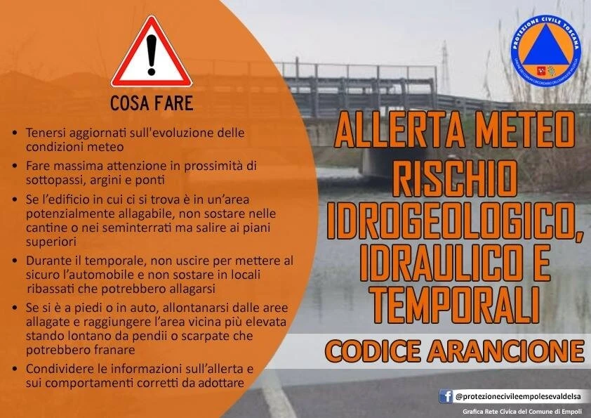 Allerta Codice Arancione per i rischi IDROGEOLOGICO-IDRAULICO RETICOLO MINORE E TEMPORALI FORTI in tutti i Comuni dell’Empolese Valdelsa, per la giornata di domani Mercoledì 22 ottobre 2025.