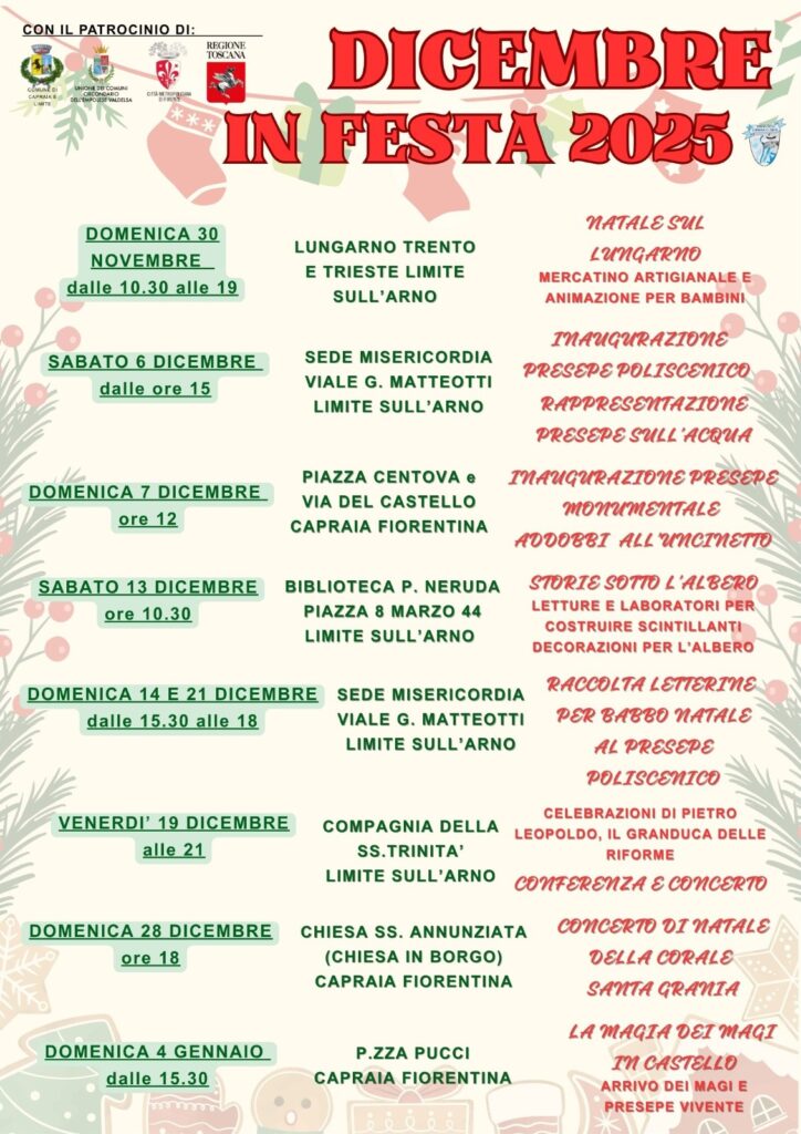 Capraia e Limite 26.11.25 – E’ tutto pronto a Capraia e Limite per il periodo delle festività natalizie con tante iniziative che animeranno il territorio fino a gennaio, organizzate dalla Pro Loco di Capraia e Limite in collaborazione con le associazioni e il patrocinio del Comune di Capraia e Limite, della Regione Toscana, della Città Metropolitana di Firenze e dell’Unione dei Comuni Circondario dell’Empolese-Valdelsa.